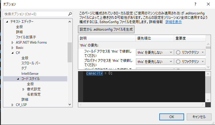 見て分かる通り、標準アナライザが検出する項目は非常に多岐に渡ります。更に言うと、何故かこの画面ではカスタマイズが出来ない項目があります。例えば、メソッド名がパスカルケースになっていない事を指摘するIDE0016のカスタマイズが出来ません。これらについてはメニューの「ツール>オプション>テキストエディター>コードスタイル」内で設定します(下図例)。
