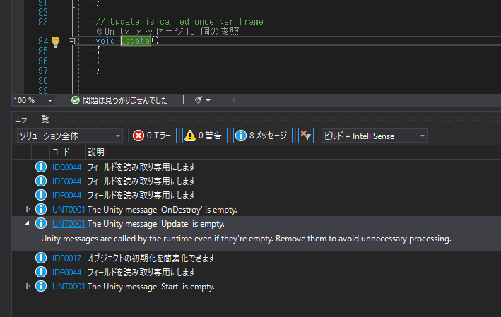 「UNT」で始まるコードが、Unityアナライザの解析結果です。選択されている「UNT0001」は「コード内に空のUnity messagesがある」という指摘です。UnityにはOnDestroy()、Start()、Update()などの、messagesと呼ばれるメソッドがあり、これらは実装が空でも実行時に呼びだされます。実行コストを削減する為にこのメソッドを削除した方が良いという指摘が出ているわけです。