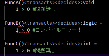 FuncA()<transacts><decides>:void = 1 > 0 #問題無し FuncB()<transacts><decides>:logic = 1 > 0 #コンパイルエラー! FuncC()<transacts><decides>:int = 1 > 0 #問題無し